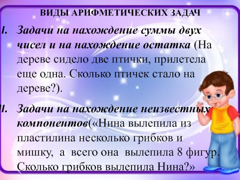 ВИДЫ АРИФМЕТИЧЕСКИХ ЗАДАЧЗадачи на нахождение суммы двух чисел и на нахождение остатка (На дереве сидело две птички, прилетела еще одна. Сколько птичек стало на дереве?).Задачи на нахождение неизвестных компонентов(«Нина вылепила из пластилина несколько гриб­ков и мишку,