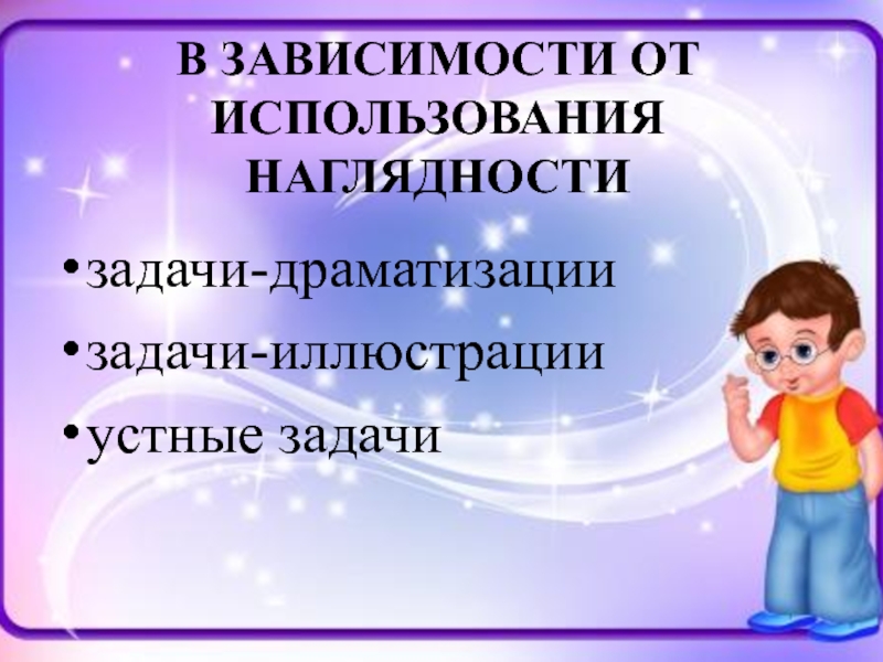 В ЗАВИСИМОСТИ ОТ ИСПОЛЬЗОВАНИЯ НАГЛЯДНОСТИзадачи-драматизации задачи-иллюстрации устные задачи