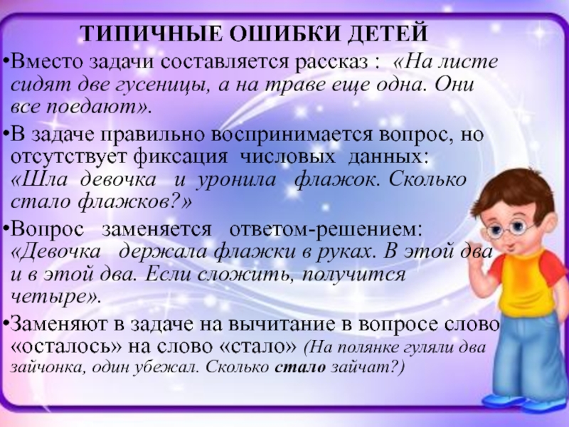 ТИПИЧНЫЕ ОШИБКИ ДЕТЕЙВместо задачи составляется рассказ : «На листе сидят две гусеницы, а на траве еще одна.