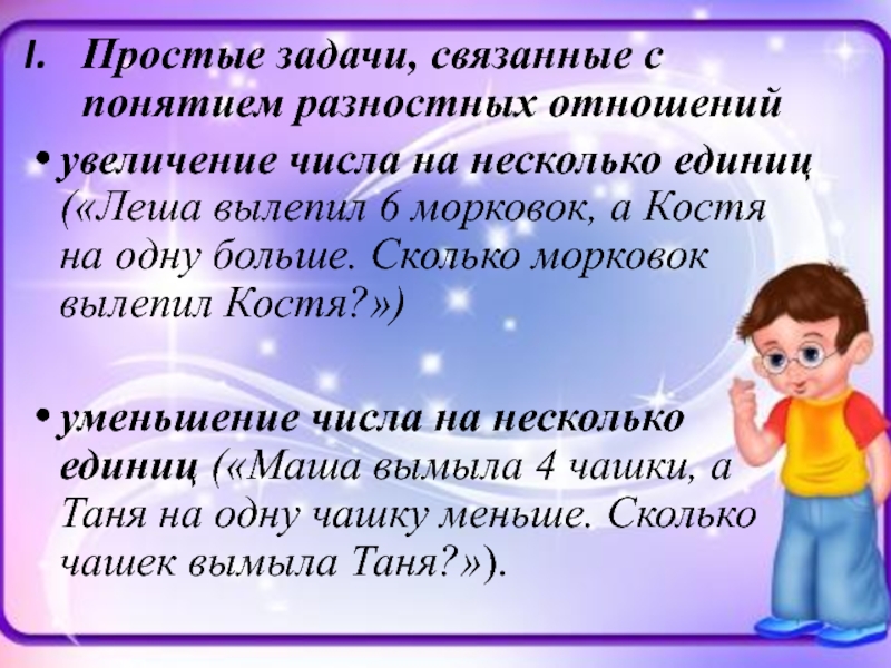 Простые задачи, связанные с понятием разностных отношенийувеличение числа на несколько единиц («Леша вылепил 6 морковок, а Костя