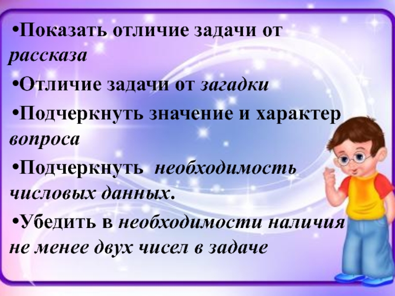 Показать отличие задачи от рассказа Отличие задачи от загадки Подчеркнуть значение и характер вопросаПодчеркнуть необходимость числовых данных.Убедить