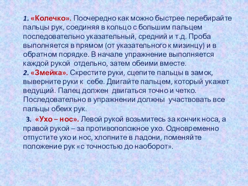 можно быстрее перебирайте пальцы рук, соединяя в кольцо с большим пальцем последовательно указательный, средний и т.д. Проба выполняется в прямом (от указательного к мизинцу) и в обратном порядке. В начале упражнение выполняется каждой рукой отдельно, затем обеими вместе.