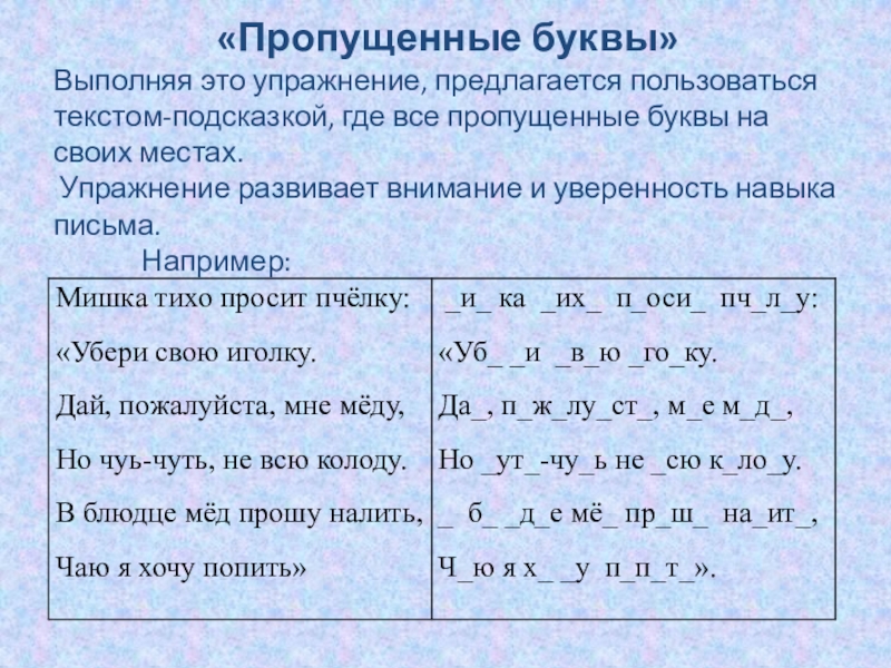 Выполняя это упражнение, предлагается пользоваться текстом-подсказкой, где все пропущенные буквы на своих местах.