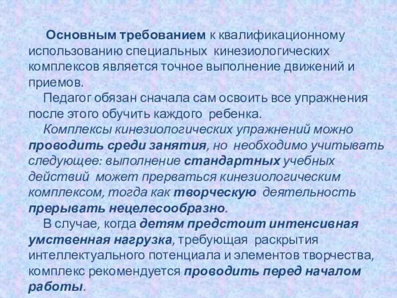 Комплексы кинезиологических упражнений можно проводить среди занятия, но необходимо учитывать следующее: выполнение стандартных учебных действий может прерваться кинезиологическим комплексом, тогда как творческую деятельность прерывать нецелесообразно.