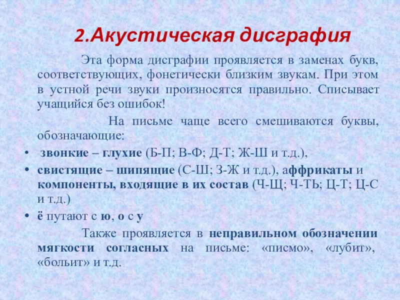 в заменах букв, соответствующих, фонетически близким звукам. При этом в устной речи звуки произносятся правильно. Списывает учащийся без ошибок!