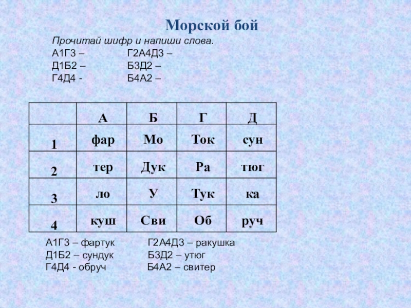Пропущенные буквы. Например, при написании слова «чемодан» пропускают 2 или 3 буквы, ребенок должен узнать слово и произнести его. Например, к_рус_ль.