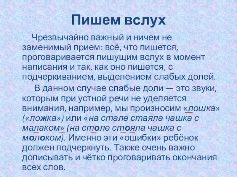 заменимый прием: всё, что пишется, проговаривается пишущим вслух в момент написания и так, как оно пишется, с подчеркиванием, выделением слабых долей.