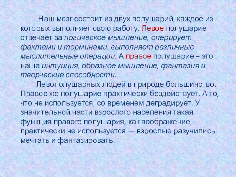 Левополушарных людей в природе большинство. Правое же полушарие практически бездействует. А то, что не используется, со временем деградирует. У значительной части взрослого населения такая функция правого полушария, как воображение, практически не используется — взрослые разучились мечтать и фантазировать.
