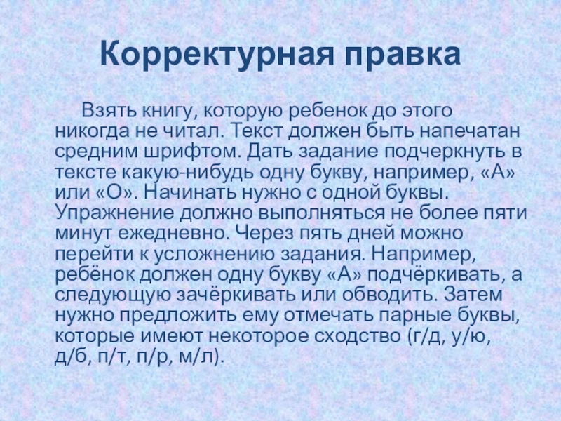 этого никогда не читал. Текст должен быть напечатан средним шрифтом. Дать задание подчеркнуть в тексте какую-нибудь одну букву, например, «А» или «О». Начинать нужно с одной буквы. Упражнение должно выполняться не более пяти минут ежедневно. Через пять дней можно перейти к усложнению задания. Например, ребёнок должен одну букву «А» подчёркивать, а следующую зачёркивать или обводить. Затем нужно предложить ему отмечать парные буквы, которые имеют некоторое сходство (г/д, у/ю, д/б, п/т, п/р, м/л).