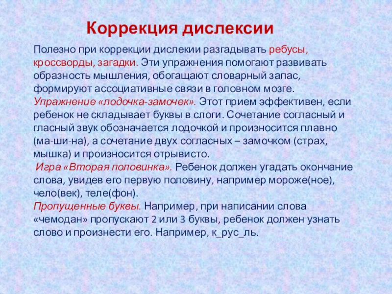 Полезно при коррекции дислекии разгадывать ребусы, кроссворды, загадки. Эти упражнения помогают