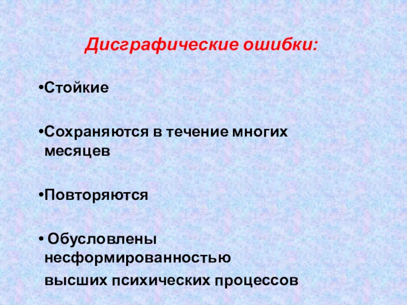 - частичное нарушение процесса письма, проявляющееся в стойких, повторяющихся ошибках.