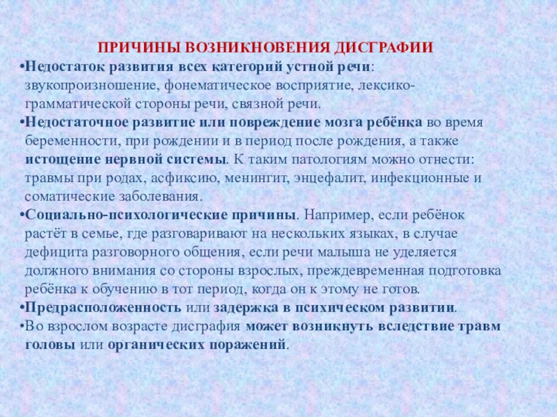 Слайд 5ПРИЧИНЫ ВОЗНИКНОВЕНИЯ ДИСГРАФИИ