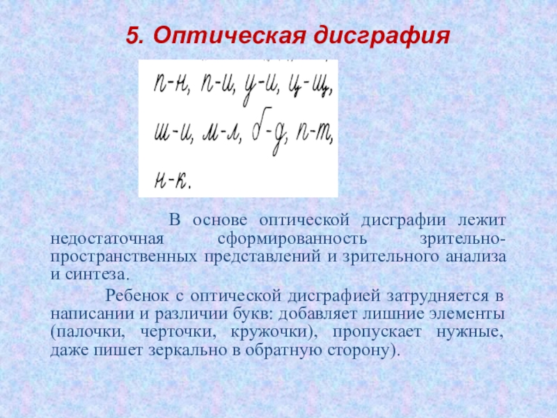 основе оптической дисграфии лежит недостаточная сформированность зрительно-пространственных представлений и зрительного анализа и синтеза.