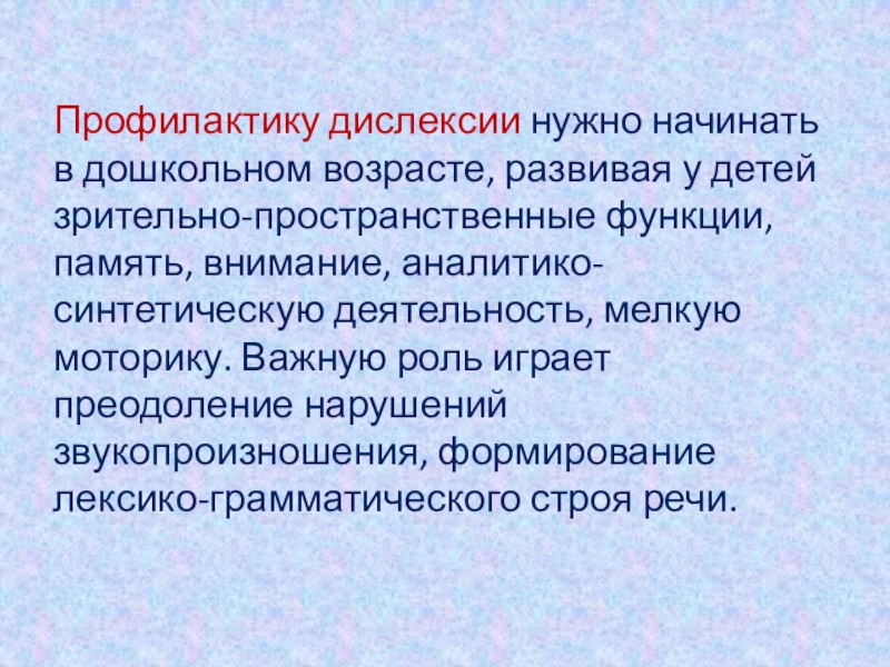 Слайд 36Профилактику дислексии нужно начинать в дошкольном возрасте, развивая у детей зрительно-пространственные