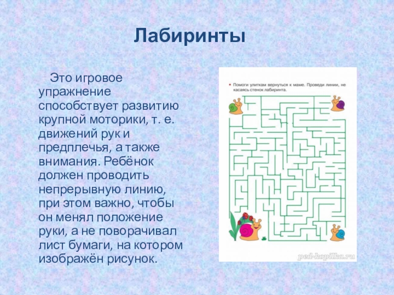 моторики, т. е. движений рук и предплечья, а также внимания. Ребёнок должен проводить непрерывную линию, при этом важно, чтобы он менял положение руки, а не поворачивал лист бумаги, на котором изображён рисунок.
