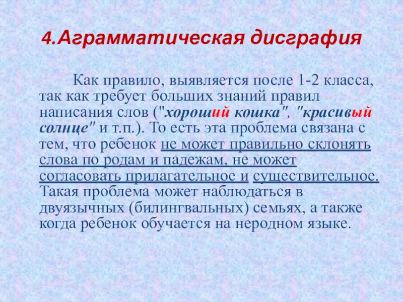 после 1-2 класса, так как требует больших знаний правил написания слов ("хороший кошка", "красивый солнце" и т.п.). То есть эта проблема связана с тем, что ребенок не может правильно склонять слова по родам и падежам, не может согласовать прилагательное и существительное. Такая проблема может наблюдаться в двуязычных (билингвальных) семьях, а также когда ребенок обучается на неродном языке.