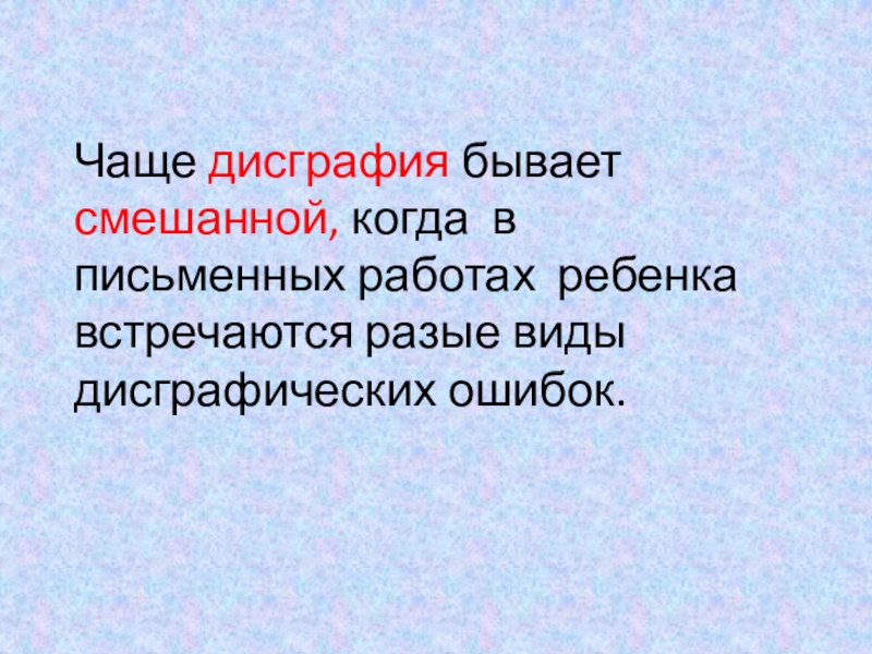Слайд 14Чаще дисграфия бывает смешанной, когда в письменных работах ребенка встречаются разые