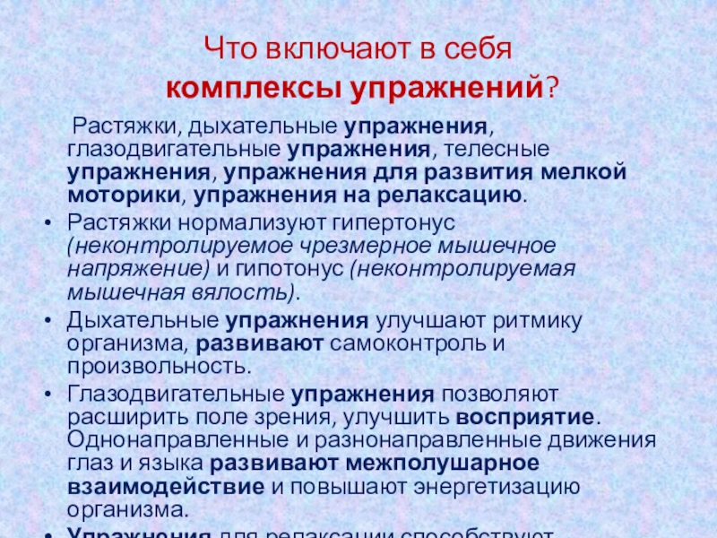 Растяжки, дыхательные упражнения, глазодвигательные упражнения, телесные упражнения, упражнения для развития мелкой моторики, упражнения на релаксацию.