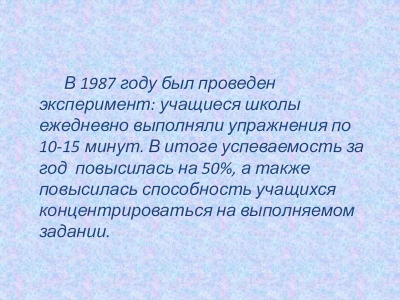 учащиеся школы ежедневно выполняли упражнения по 10-15 минут. В итоге успеваемость за год повысилась на 50%, а также повысилась способность учащихся