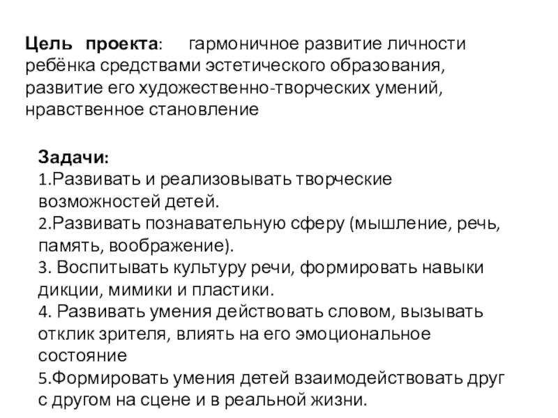 5.Формировать умения детей взаимодействовать друг с другом на сцене и в реальной жизни.