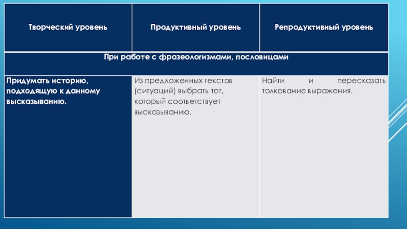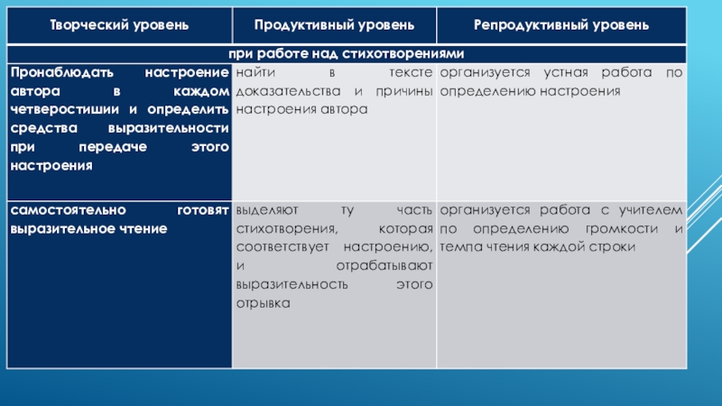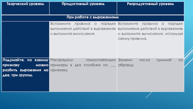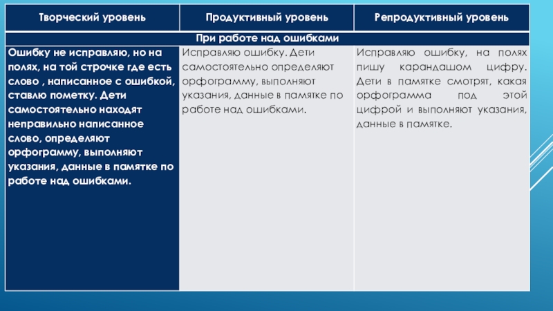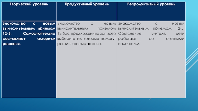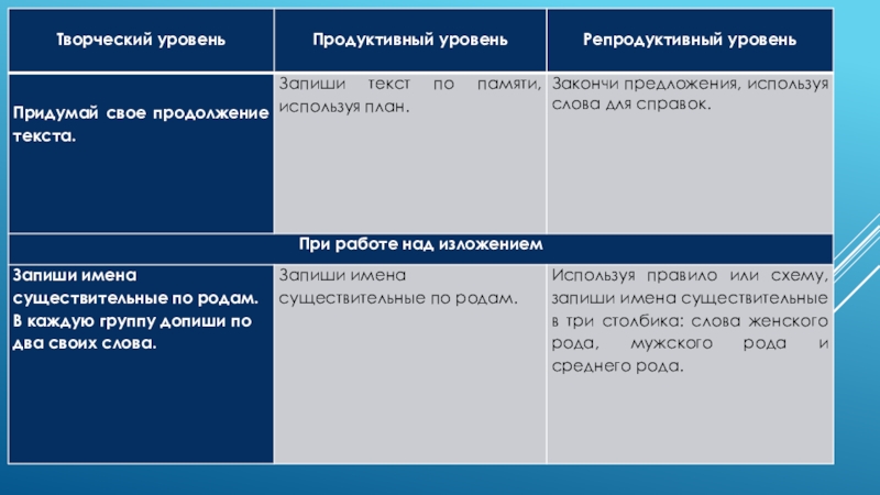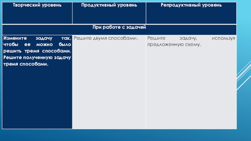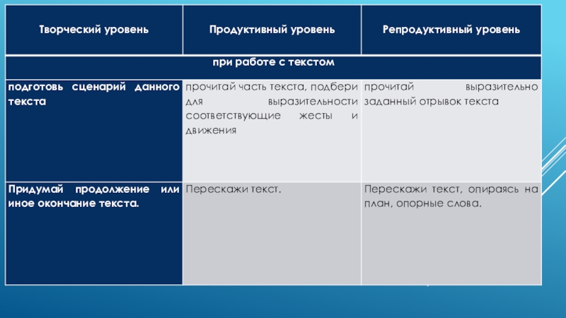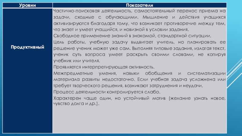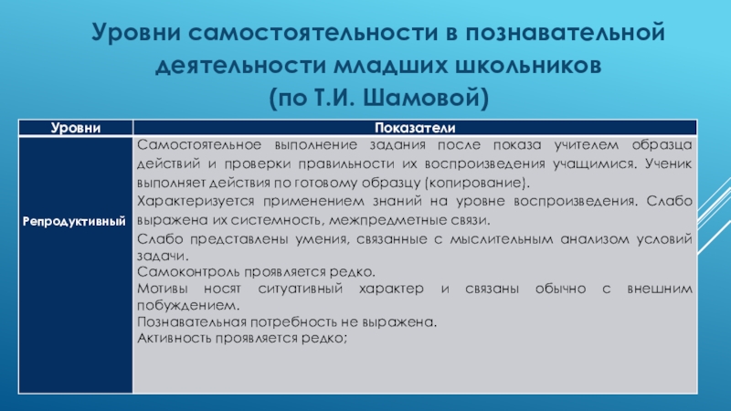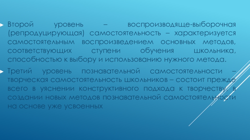 Слайд 7Второй уровень – воспроизводяще-выборочная (репродуцирующая) самостоятельность – характеризуется самостоятельным воспроизведением основных