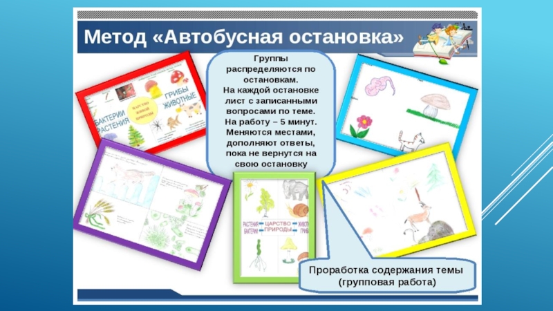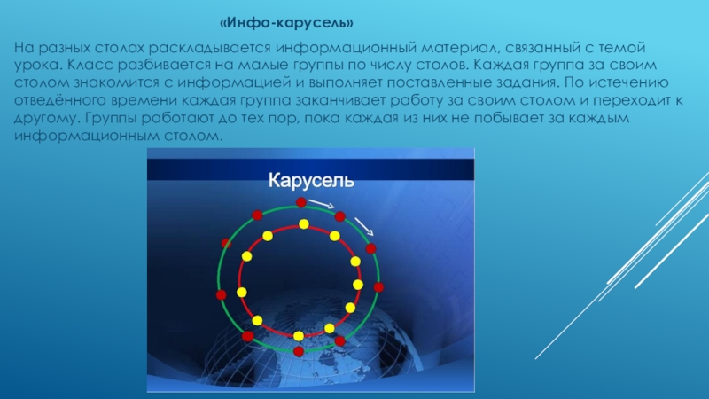 На разных столах раскладывается информационный материал, связанный с темой урока. Класс разбивается на малые группы по числу столов. Каждая группа за своим столом знакомится с информацией и выполняет поставленные задания. По истечению отведённого времени каждая группа заканчивает работу за своим столом и переходит к другому. Группы работают до тех пор, пока каждая из них не побывает за каждым информационным столом.