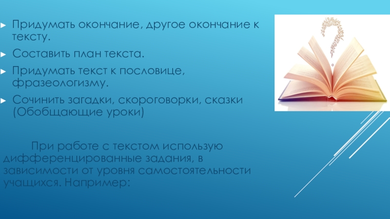 При работе с текстом использую дифференцированные задания, в зависимости от уровня самостоятельности учащихся. Например: