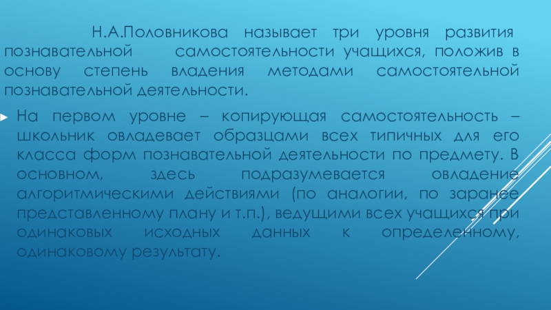 Слайд 6 Н.А.Половникова называет три уровня развития познавательной