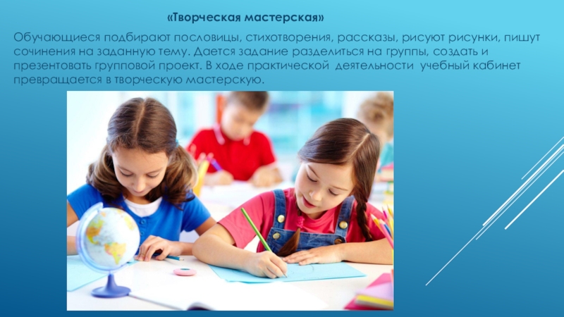 Обучающиеся подбирают пословицы, стихотворения, рассказы, рисуют рисунки, пишут сочинения на заданную тему. Дается задание разделиться на группы, создать и презентовать групповой проект. В ходе практической деятельности учебный кабинет превращается в творческую мастерскую.