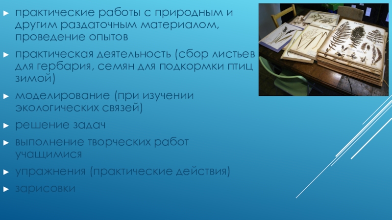 Слайд 22практические работы с природным и другим раздаточным материалом, проведение опытов