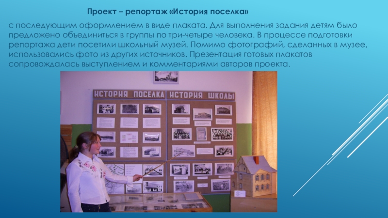 с последующим оформлением в виде плаката. Для выполнения задания детям было предложено объединиться в группы по три-четыре человека. В процессе подготовки репортажа дети посетили школьный музей. Помимо фотографий, сделанных в музее, использовались фото из других источников. Презентация готовых плакатов сопровождалась выступлением и комментариями авторов проекта.