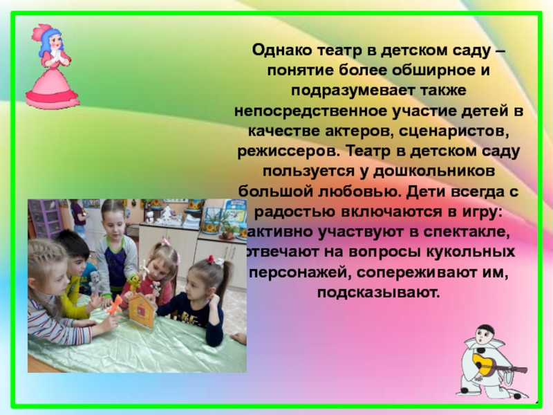 также непосредственное участие детей в качестве актеров, сценаристов, режиссеров. Театр в детском саду пользуется у дошкольников большой любовью. Дети всегда с радостью включаются в игру: активно участвуют в спектакле, отвечают на вопросы кукольных персонажей, сопереживают им, подсказывают.