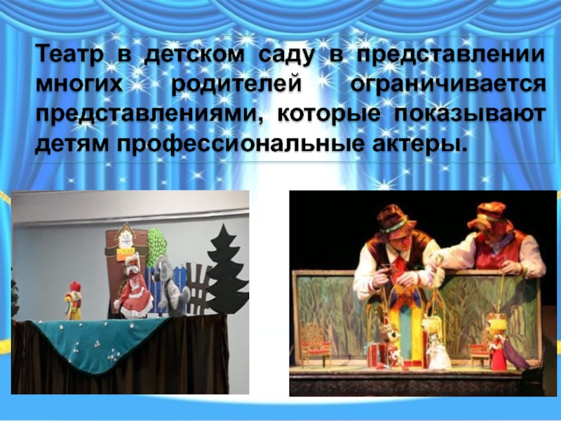 Слайд 2Театр в детском саду в представлении многих родителей ограничивается представлениями, которые