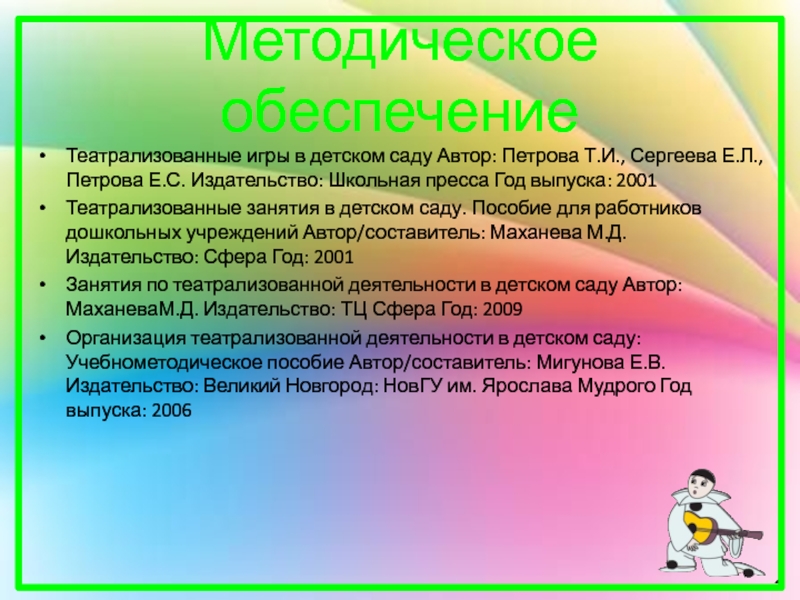 Организация театрализованной деятельности в детском саду: Учебнометодическое пособие Автор/составитель: Мигунова Е.В. Издательство: Великий Новгород: НовГУ им. Ярослава Мудрого Год выпуска: 2006