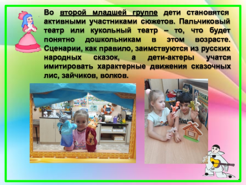 Слайд 6Во второй младшей группе дети становятся активными участниками сюжетов. Пальчиковый театр