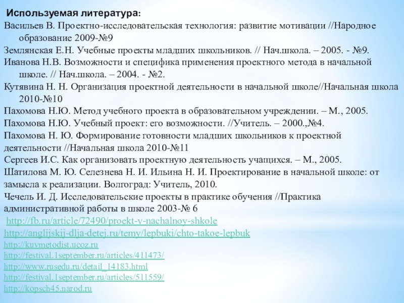 Иванова Н.В. Возможности и специфика применения проектного метода в начальной школе. // Нач.школа. – 2004. - №2.