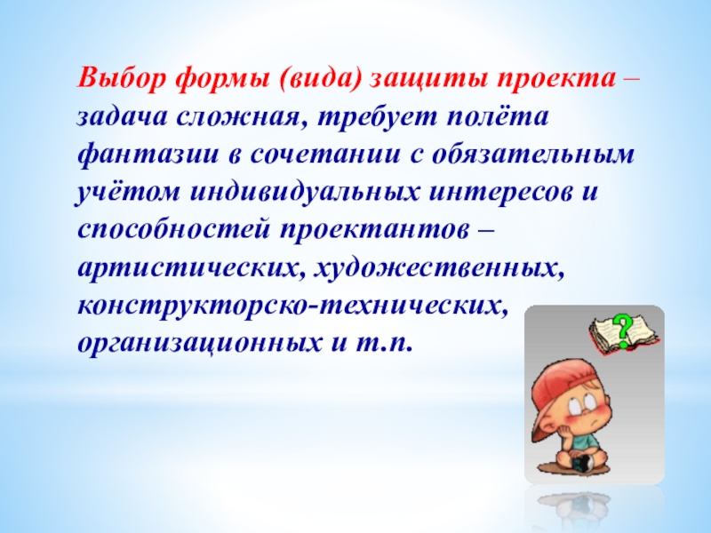 Слайд 9Выбор формы (вида) защиты проекта – задача сложная, требует полёта фантазии