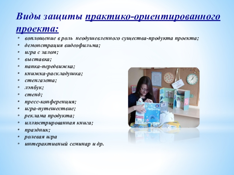 Слайд 13Виды защиты практико-ориентированного проекта: