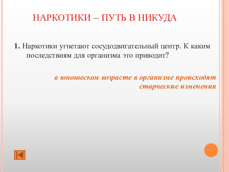 НАРКОТИКИ – ПУТЬ В НИКУДА 1. Наркотики угнетают сосудодвигательный центр. К каким последствиям для организма это приводит?