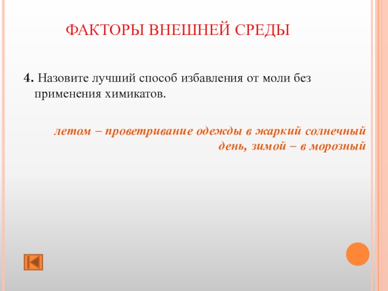 ФАКТОРЫ ВНЕШНЕЙ СРЕДЫ 4. Назовите лучший способ избавления от моли без применения химикатов. летом – проветривание одежды