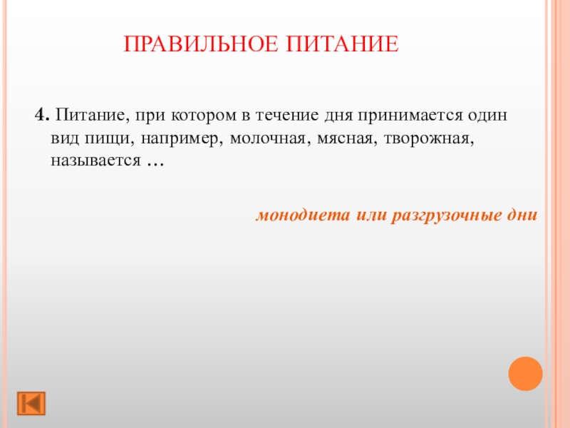 ПРАВИЛЬНОЕ ПИТАНИЕ 4. Питание, при котором в течение дня принимается один вид пищи, например, молочная, мясная, творожная,
