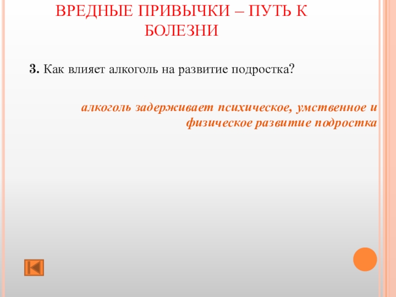 ВРЕДНЫЕ ПРИВЫЧКИ – ПУТЬ К БОЛЕЗНИ 3. Как влияет алкоголь на развитие подростка? алкоголь задерживает психическое, умственное