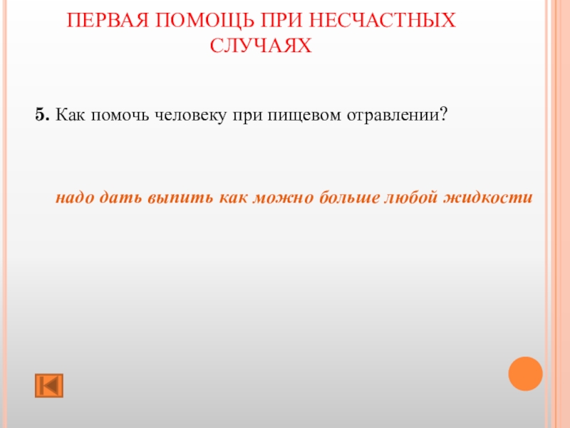 ПЕРВАЯ ПОМОЩЬ ПРИ НЕСЧАСТНЫХ СЛУЧАЯХ 5. Как помочь человеку при пищевом отравлении? надо дать выпить как можно