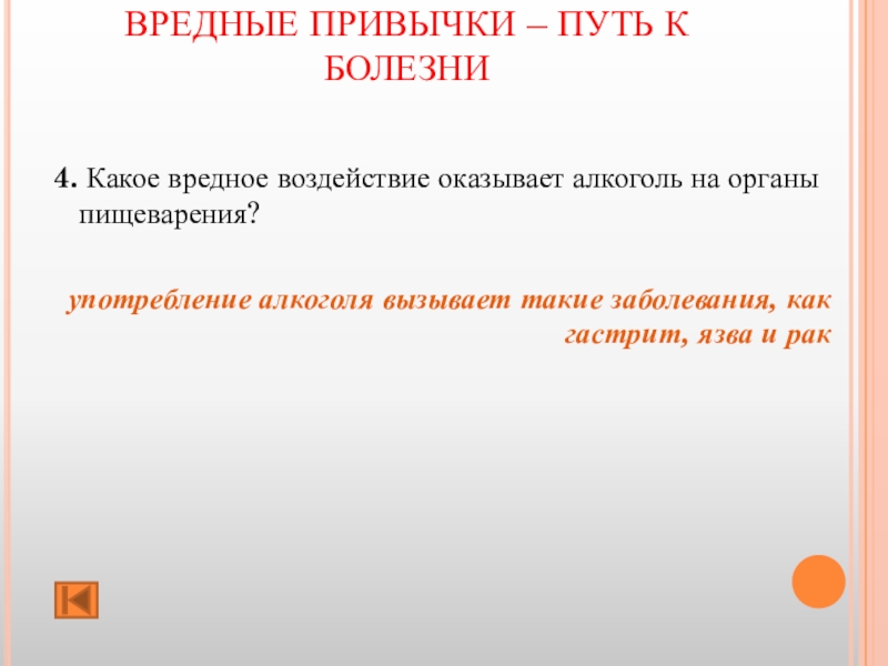 ВРЕДНЫЕ ПРИВЫЧКИ – ПУТЬ К БОЛЕЗНИ 4. Какое вредное воздействие оказывает алкоголь на органы пищеварения? употребление алкоголя