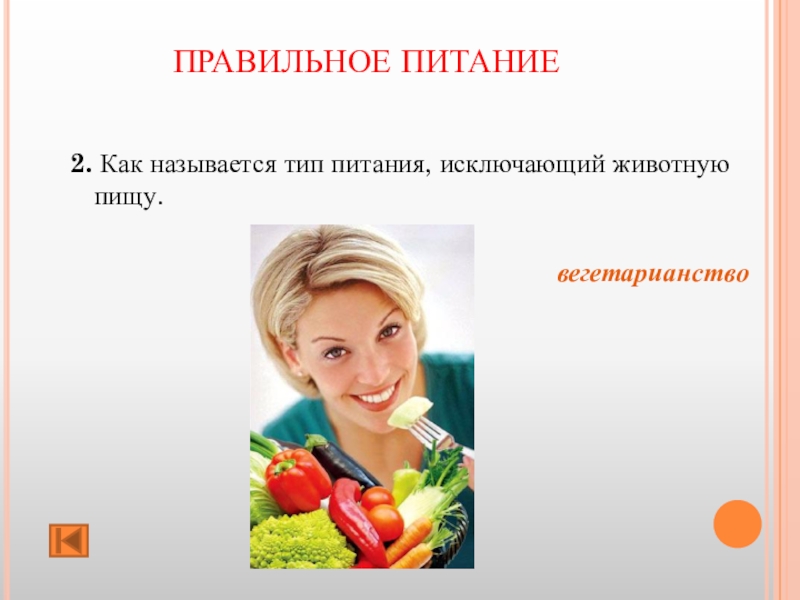 ПРАВИЛЬНОЕ ПИТАНИЕ 2. Как называется тип питания, исключающий животную пищу. вегетарианство