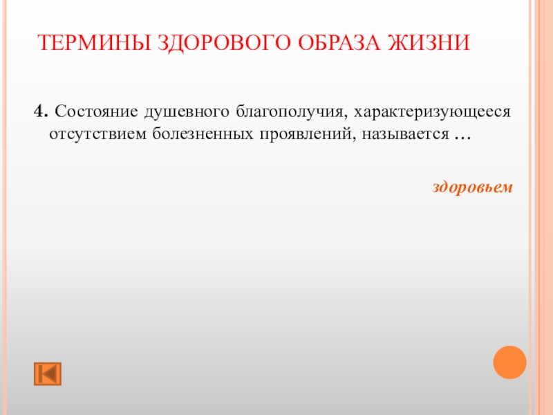 ТЕРМИНЫ ЗДОРОВОГО ОБРАЗА ЖИЗНИ 4. Состояние душевного благополучия, характеризующееся отсутствием болезненных проявлений, называется … здоровьем