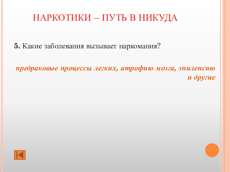 НАРКОТИКИ – ПУТЬ В НИКУДА 5. Какие заболевания вызывает наркомания? предраковые процессы легких, атрофию мозга, эпилепсию и