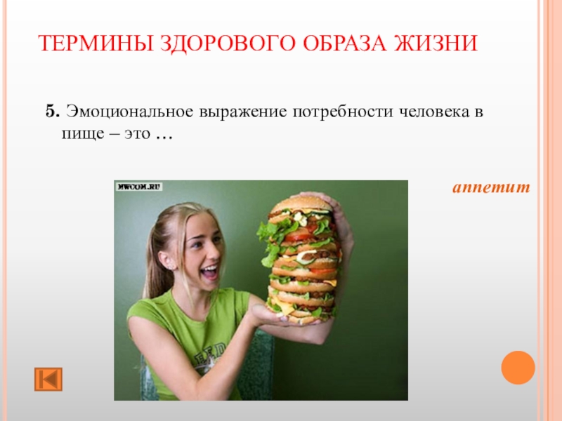 ТЕРМИНЫ ЗДОРОВОГО ОБРАЗА ЖИЗНИ 5. Эмоциональное выражение потребности человека в пище – это … аппетит