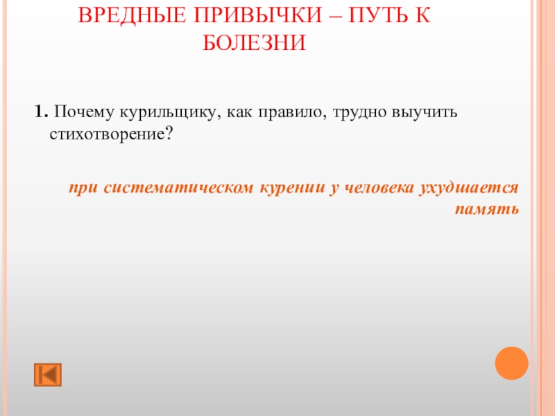 ВРЕДНЫЕ ПРИВЫЧКИ – ПУТЬ К БОЛЕЗНИ 1. Почему курильщику, как правило, трудно выучить стихотворение? при систематическом курении