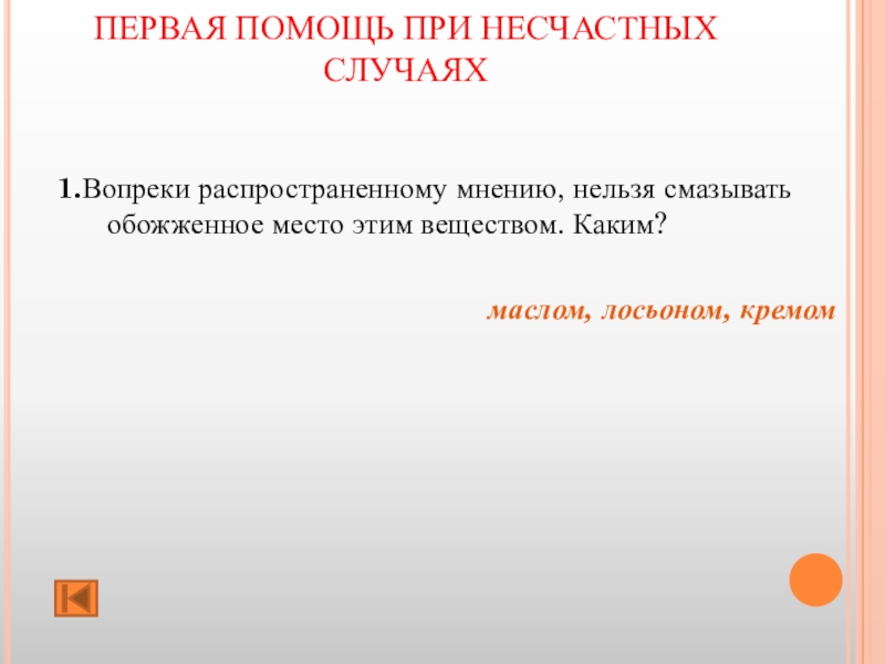 ПЕРВАЯ ПОМОЩЬ ПРИ НЕСЧАСТНЫХ СЛУЧАЯХ 1.Вопреки распространенному мнению, нельзя смазывать обожженное место этим веществом. Каким? маслом, лосьоном,